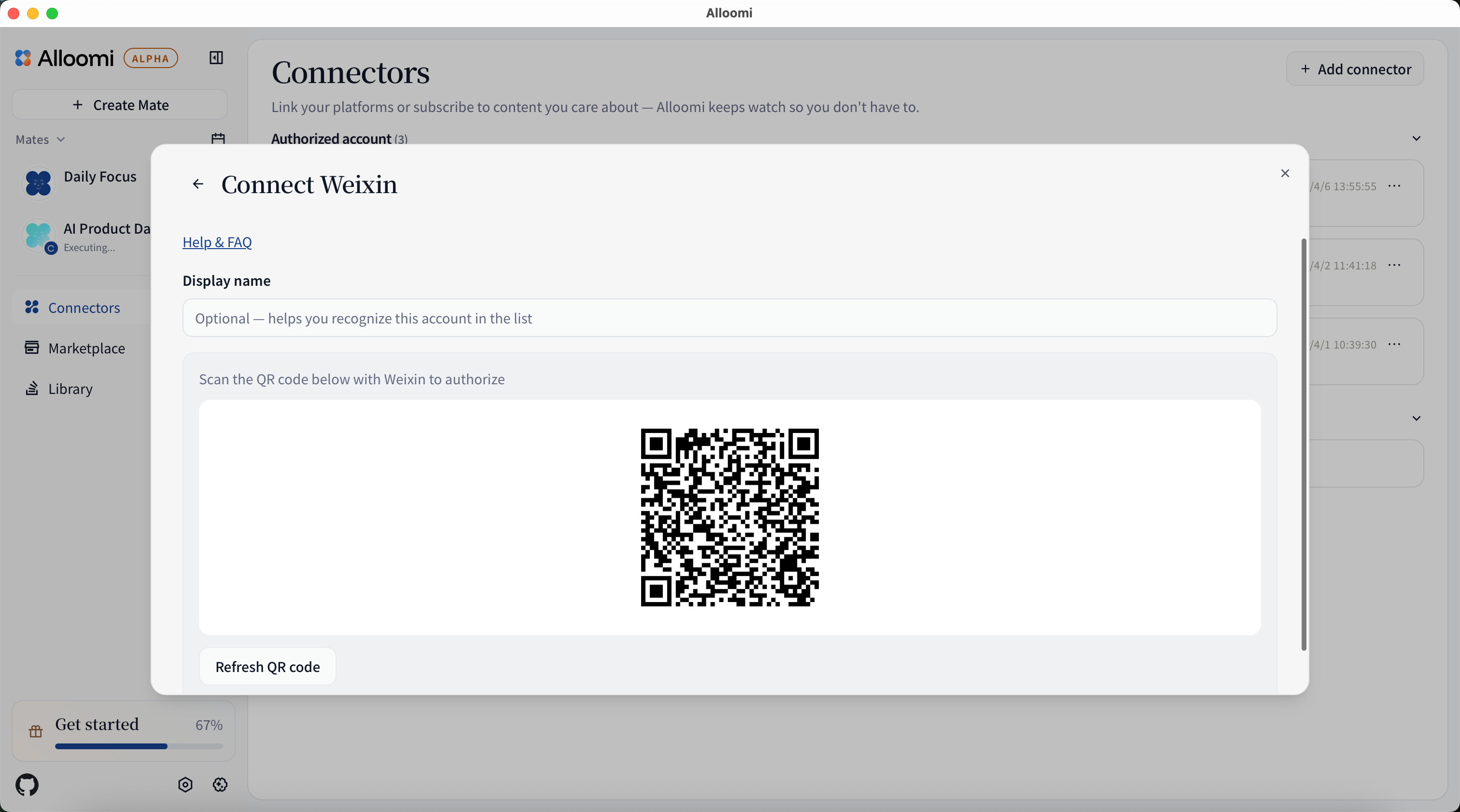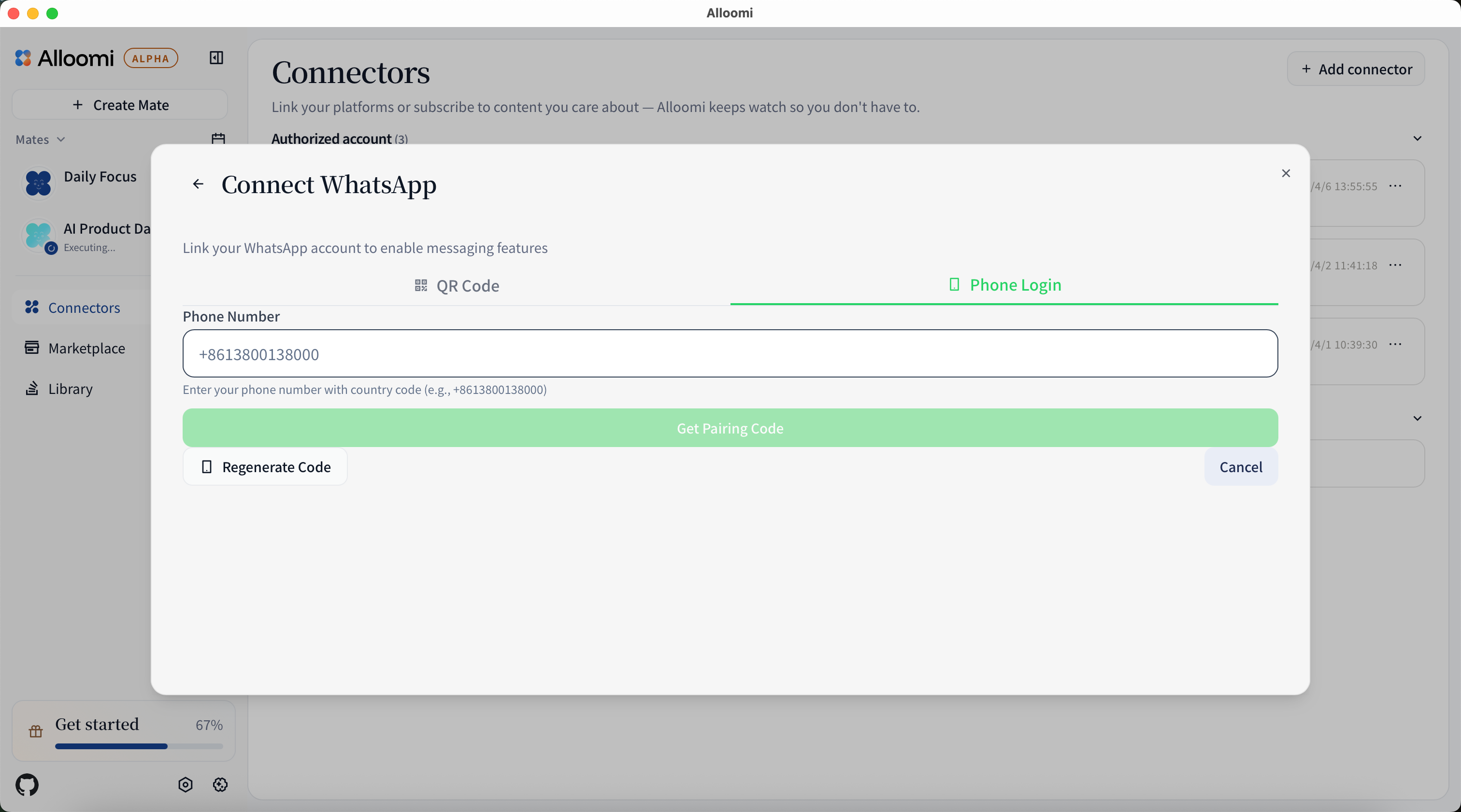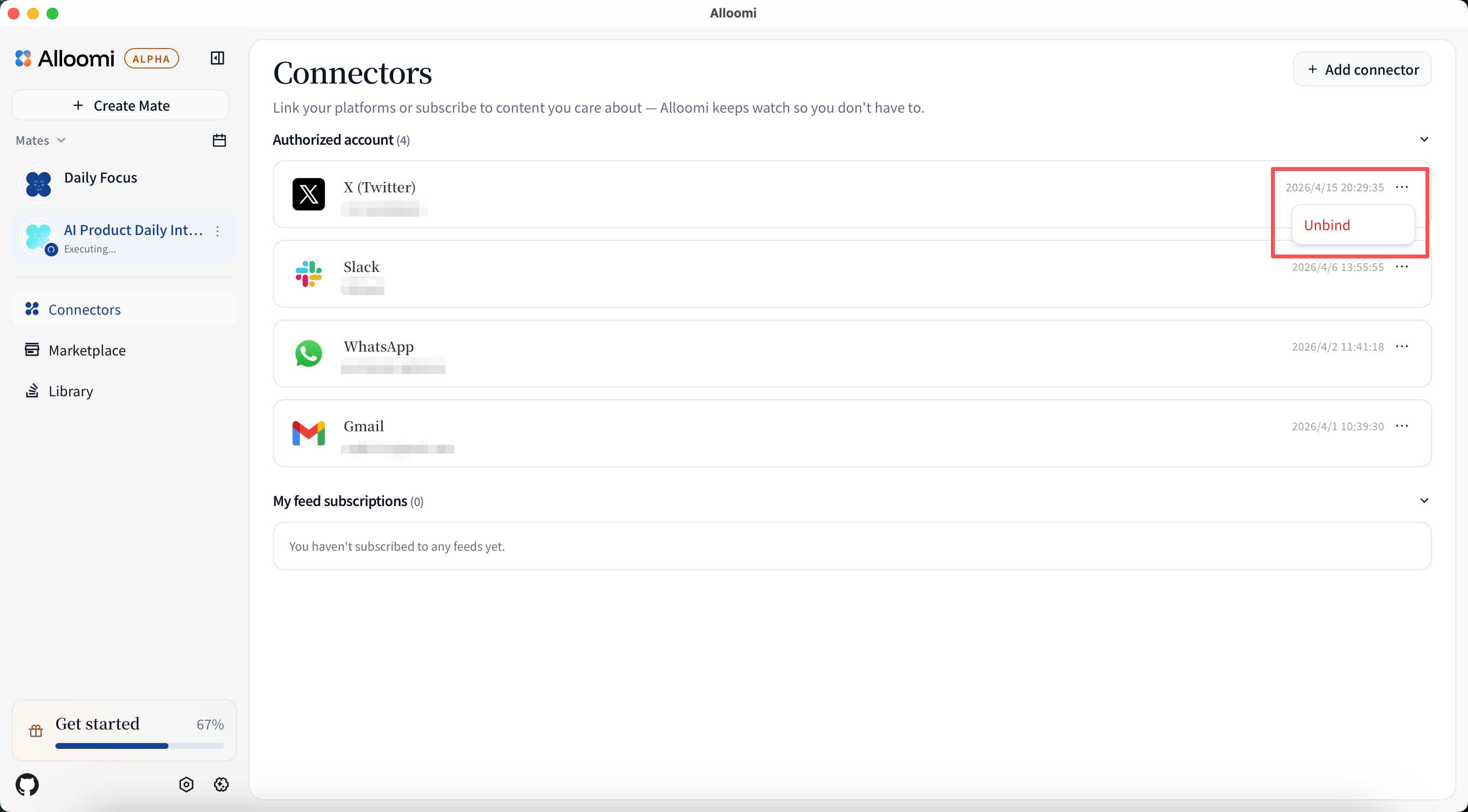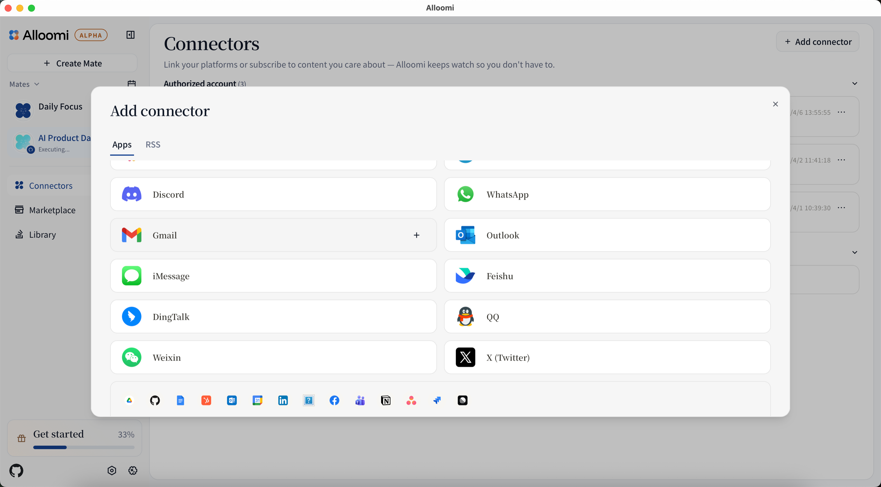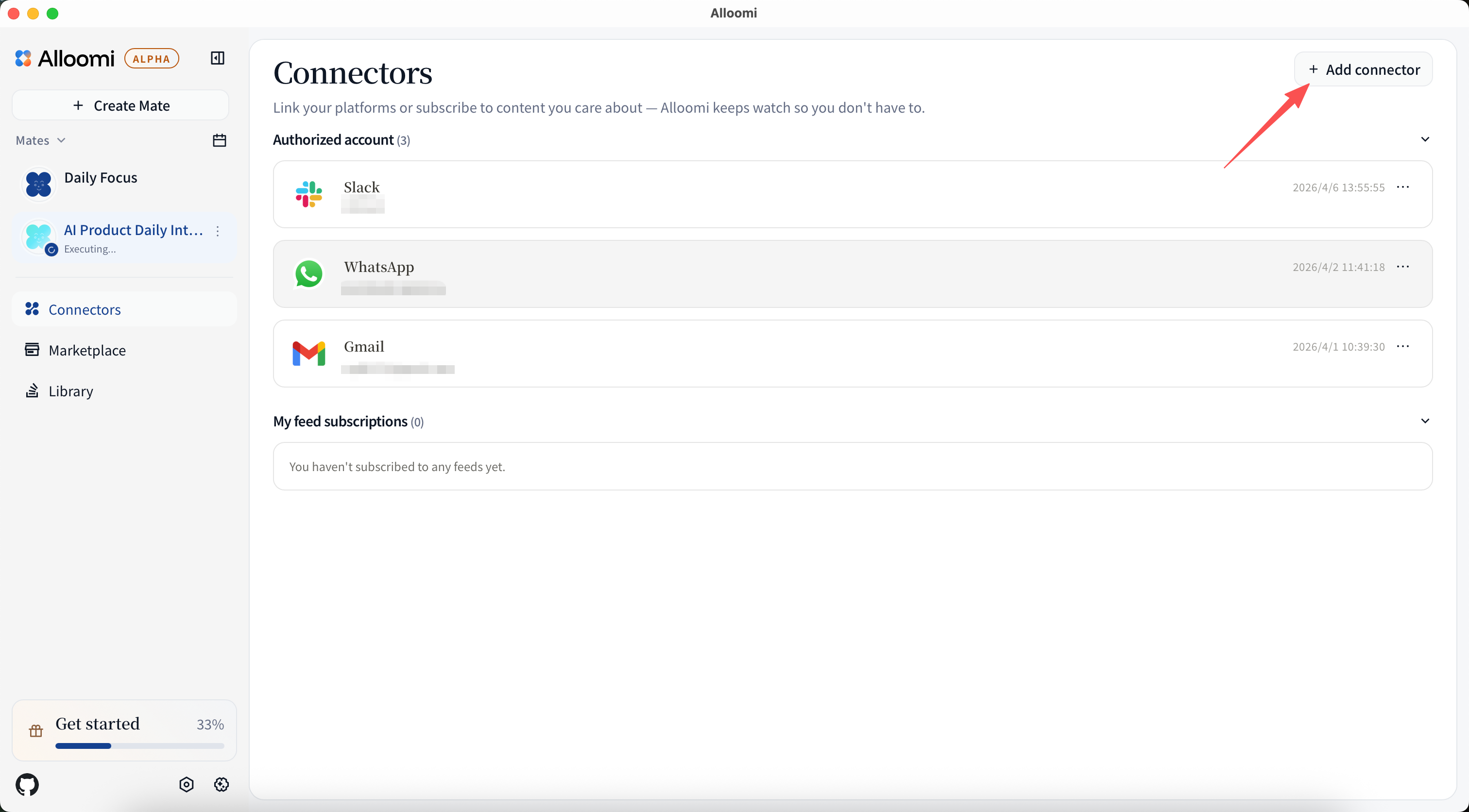To add a connector, open Settings → Connectors and click + Add New Connector. Alloomi will guide you through the authorization process for each platform.