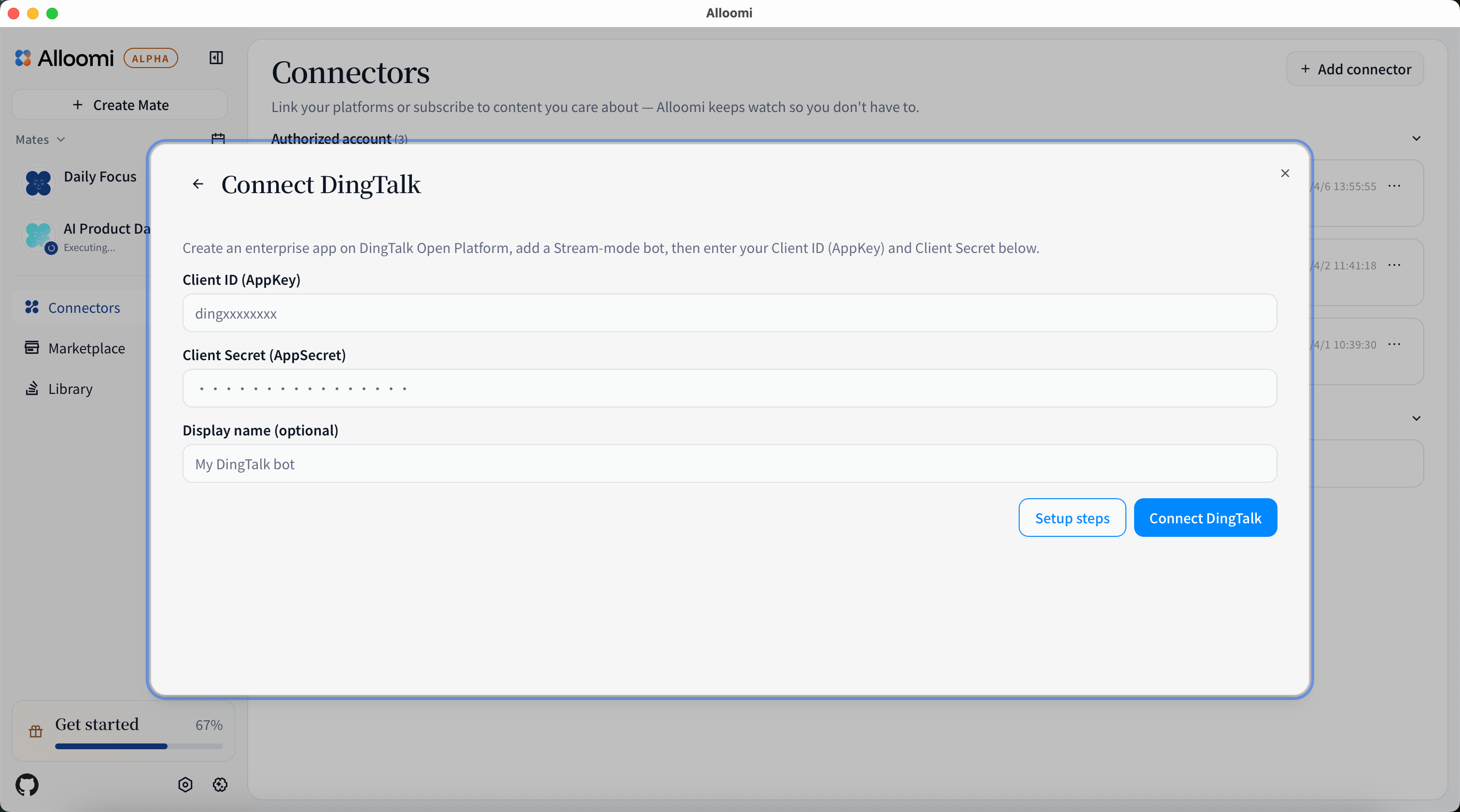 💡 Stream mode means Alloomi connects directly via WebSocket — no server or domain setup needed. Once connected, you can chat with your bot directly in DingTalk.
