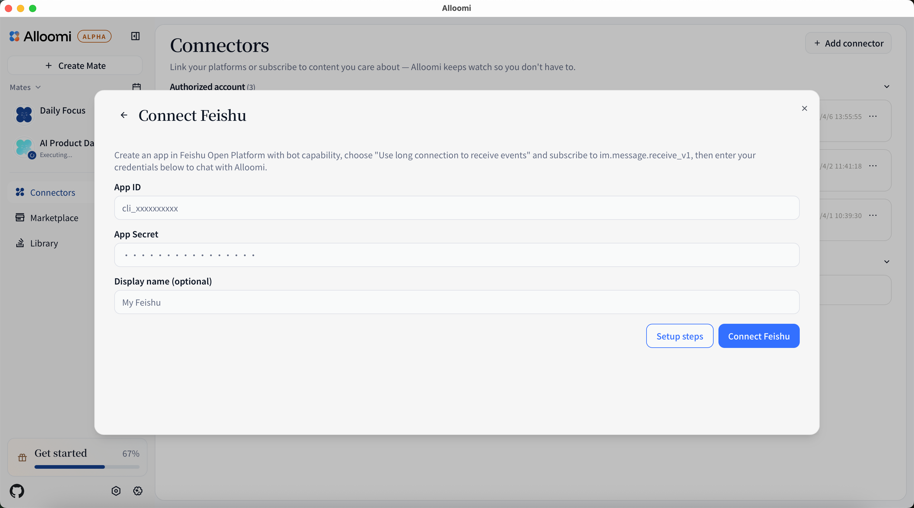 - In Alloomi, go to Settings → Connectors → + Add New Connector → select Feishu