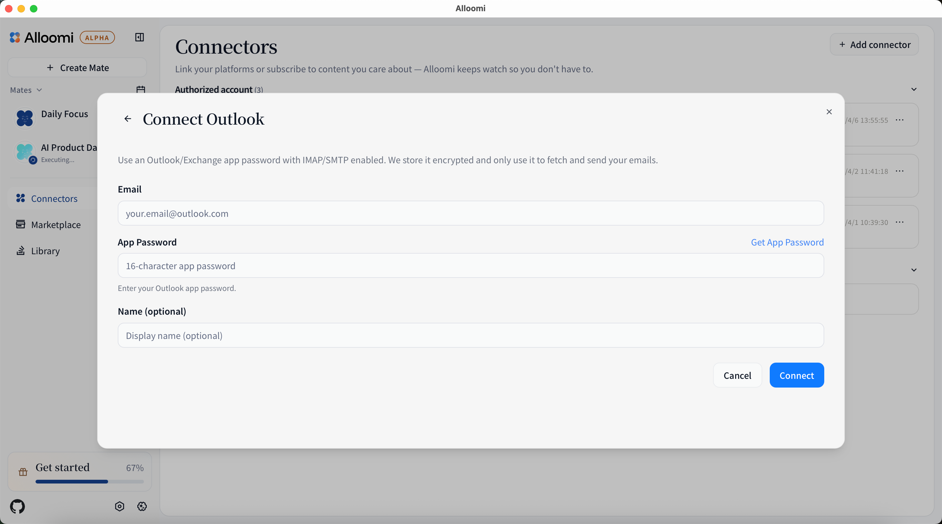 After clicking [Connect Outlook], enter your email address and app password to authorize.