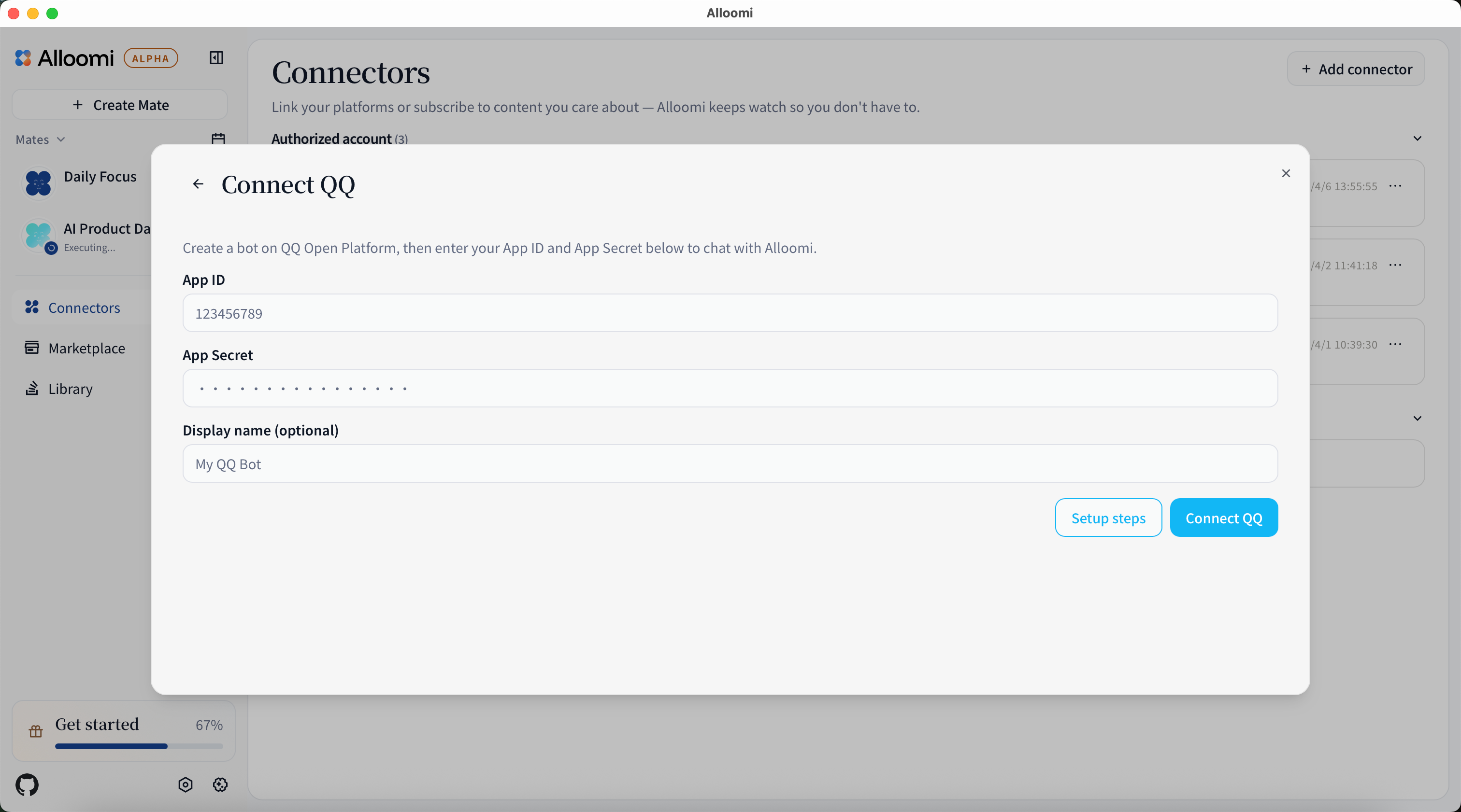 - Click Connect — Alloomi establishes a long-lived WebSocket connection to your bot