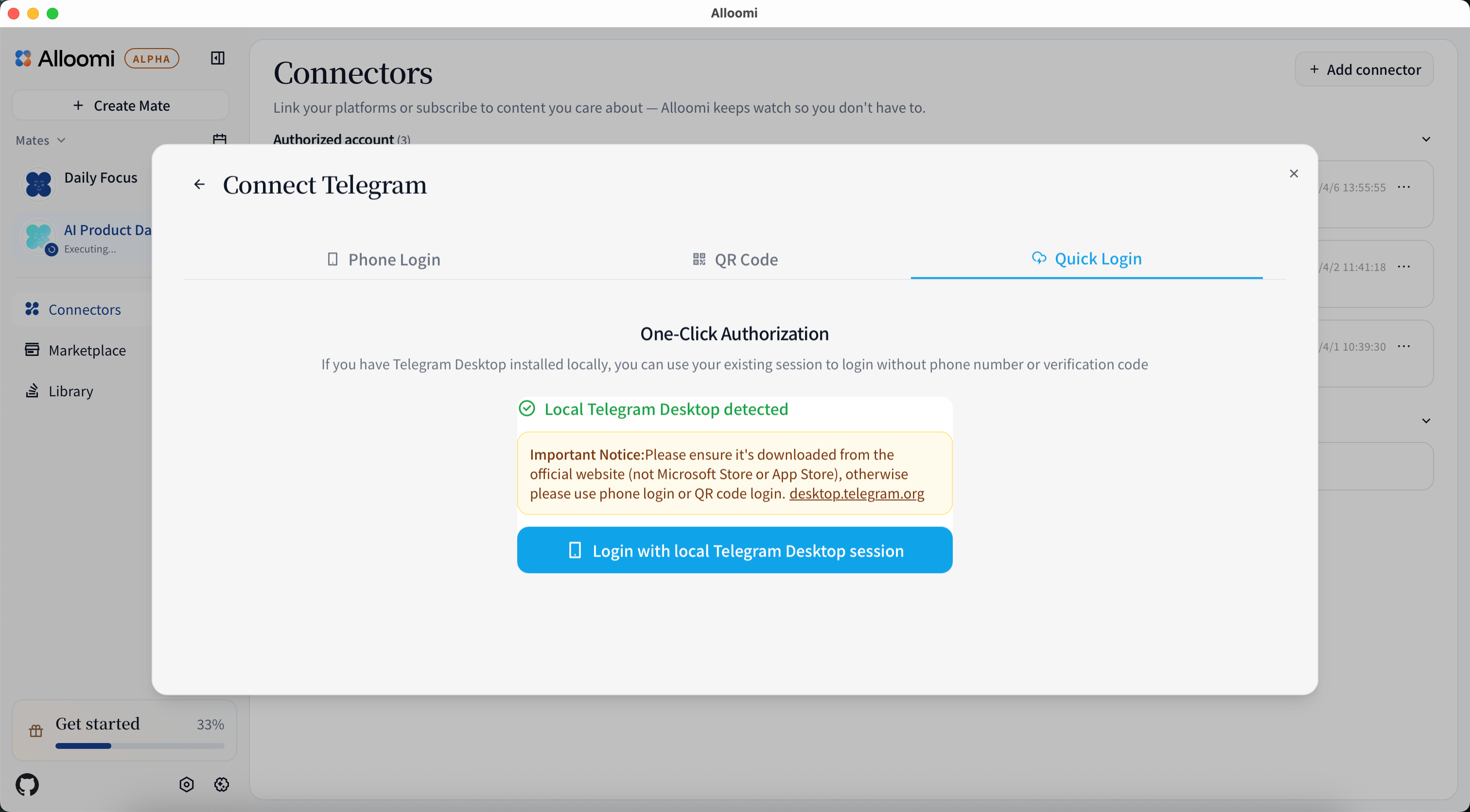 Or choose to authorize by quick login in the Telegram app if you have official telegram desktop installed locally, you can use your existing session to login without phone number or verification code