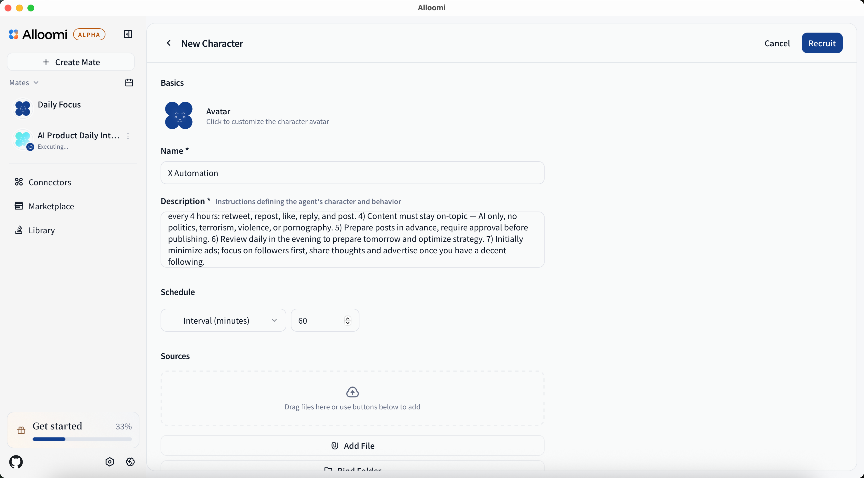 Paste a detailed prompt into Alloomi’s agent chat covering objectives, persona, operation frequency, content boundaries, approval workflow, and growth phasing: